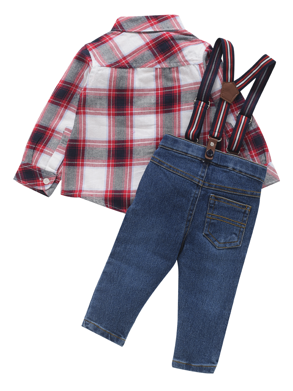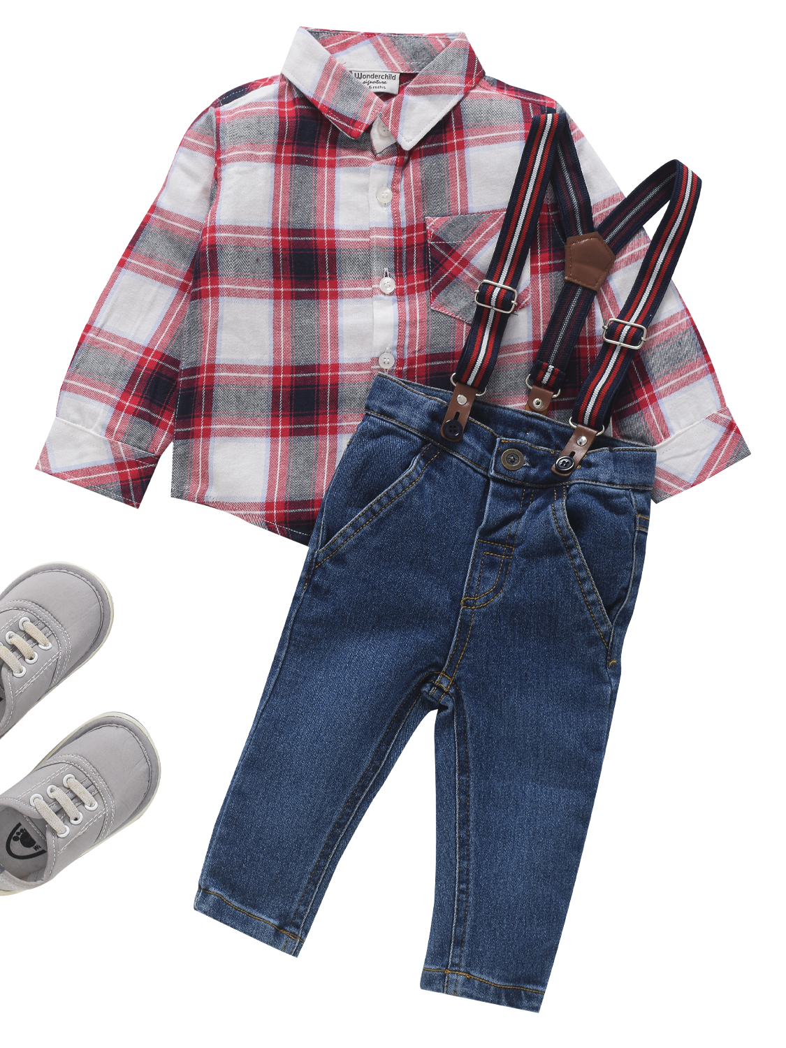 Boys Shirt and Denim Set - Checks: Perfect for your little one in the colder months! Get ready for cuteness overload with our red checked shirt and denim set complete with suspenders. Don't miss out on this must-have winter outfit for your adorable baby!