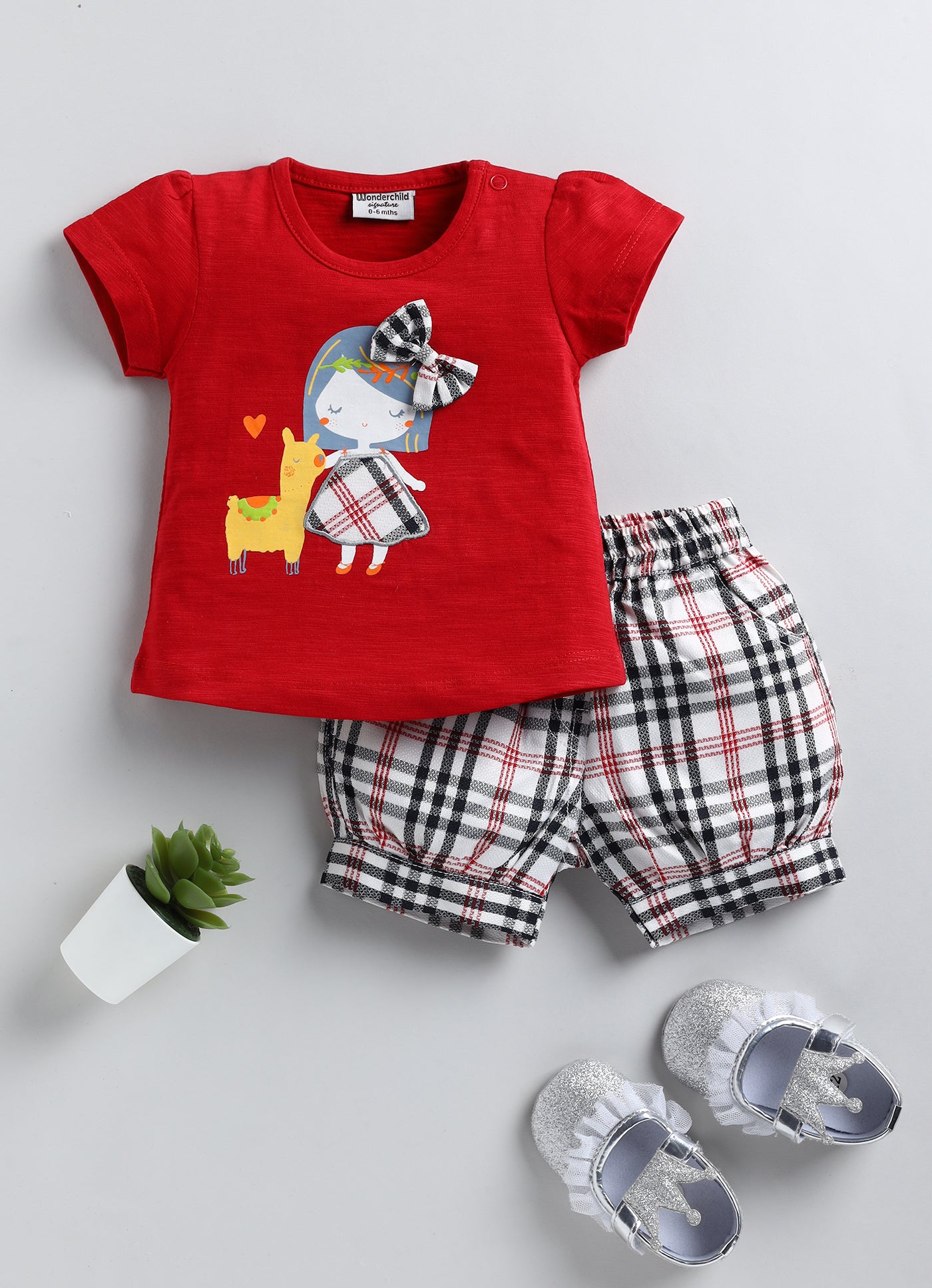 Passionately believing in the value of our product, we present the Wonderchild Short Sleeve Girl Applique Tee with Check Shorts in red. This set includes a pretty t-shirt with a red applique and check shorts. The t-shirt features a round neck and snap buttons, making it perfect for your little princess. Experience luxury and style with this set.